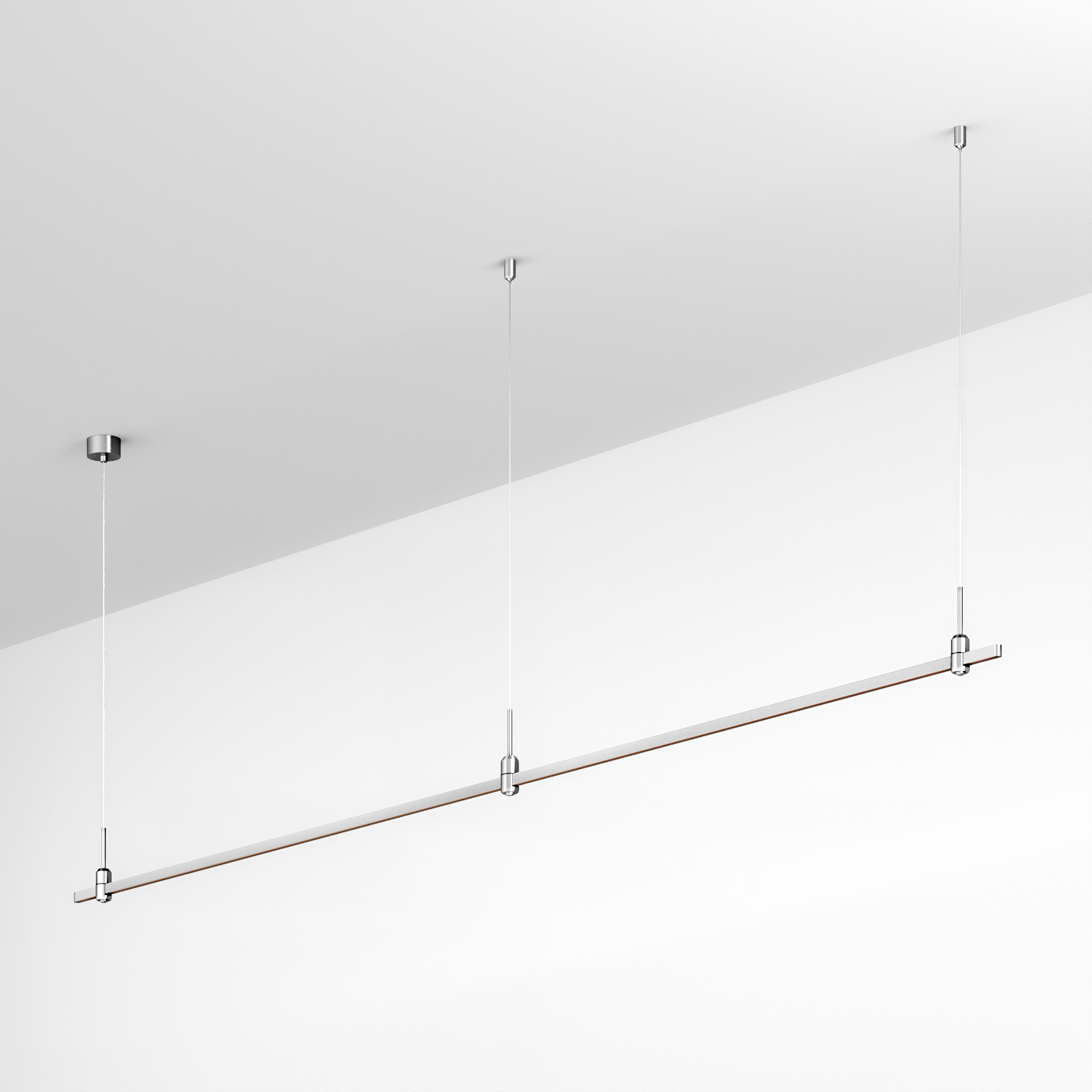 Подвесная линейная конструкция APRIORI. В комплекте трек с аксессуарами и гибкими подвесами длиной 1500мм. Размер ДxШxВ: 3000x17x22мм. Размер (с учетом заглушек) ДxШxВ: 3021x17x22мм. Монтируется подвесным способом. Для установки необходима фиксация на потолочной поверхности с использованием трех опорных точек подвеса. Шинопровод рассчитан на работу с безопасным напряжением DC48В. Изготавливается из алюминия, анодированного в цвет титан. Светильники и источники питания приобретаются отдельно.