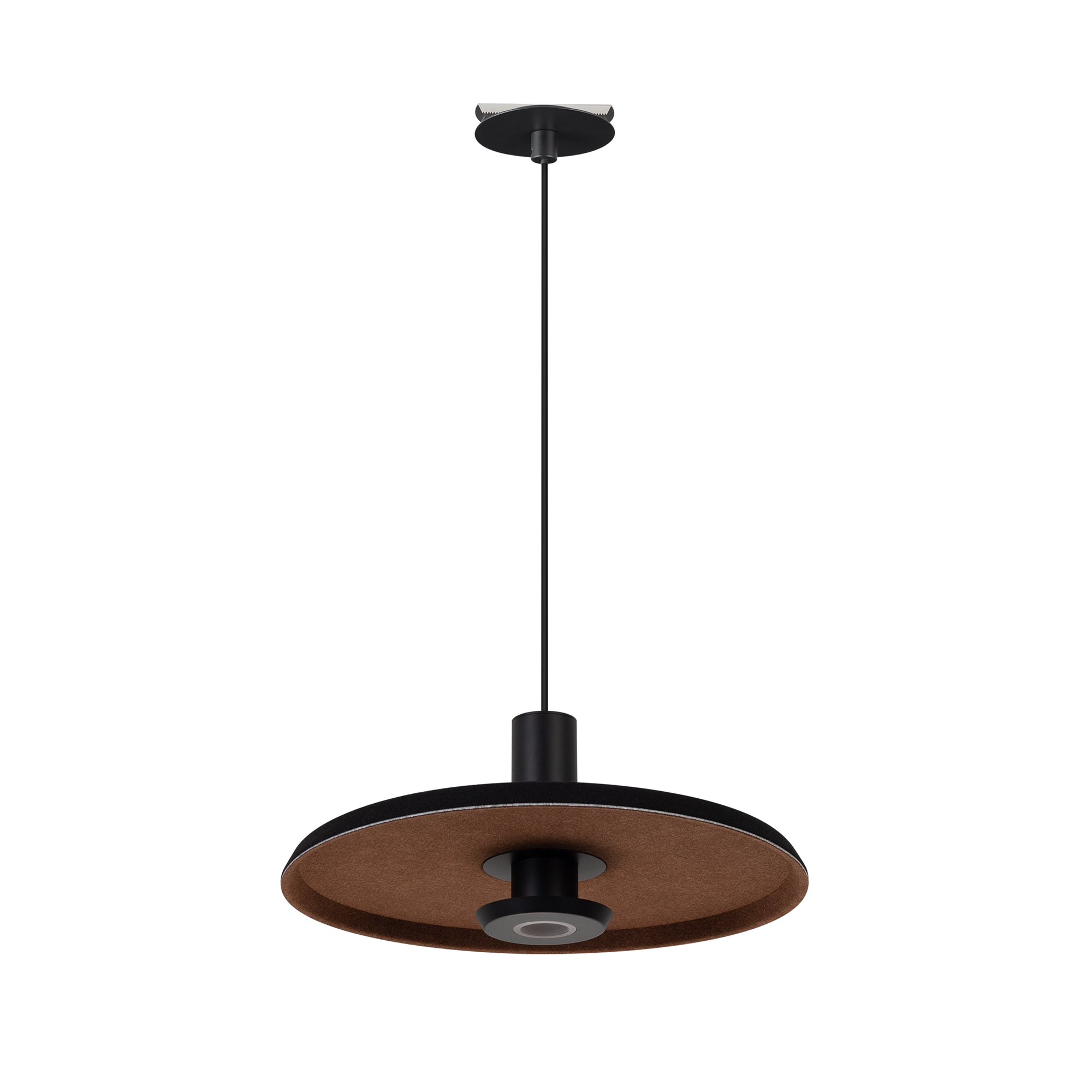 Подвесной светильник. Мощность 12 Вт, св. поток 708 лм, 59 лм/Вт, теплый 3000 K, CRI>94, угол 36°, напряжение питания 230 В. Черный фигурный корпус из переработанного фетра с внутренней поверхностью цвета мокко, линза-рассеиватель из PMMA, степень защиты IP20. Размер: диаметр 350 мм, высота 145 мм. Монтаж подвесной, длина подвеса 2000 мм, регулируемая. В комплекте 2 вида чаш. Габариты чаши (встраиваемая) Ø80 х 23 мм, врезное отверстие Ø60 мм. Габариты чаши (накладная) Ø120 x 35 мм. Драйвер 59 В, 300 мА, пульсация <1%. Управление по TRIAC.