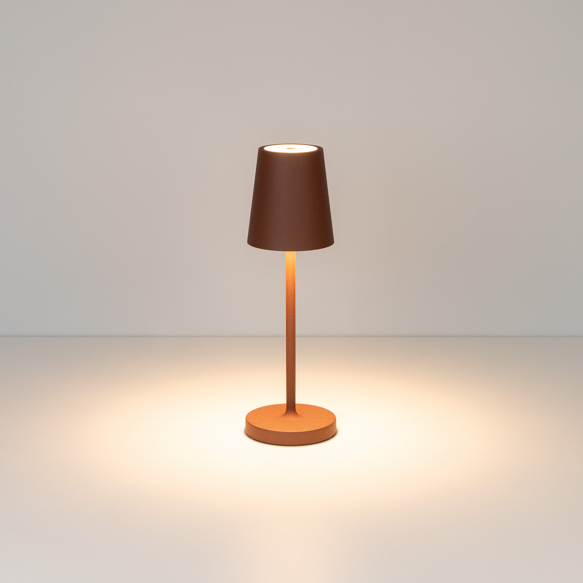 Настольный светильник со встроенным аккумулятором 1.5Вт, алюминиевый корпус, цвет терракотовый. Цвет ТЕПЛЫЙ БЕЛЫЙ 2200-2700-3000K, св.поток 110-130 лм, CRI(Ra)>80, угол 90°. Размер Ф75x250мм. IP54. Зарядка от сети переменного тока AC220-240V. Тип встроенного аккумулятора 1500мАч Li-ion, напряжение батареи 3.7V