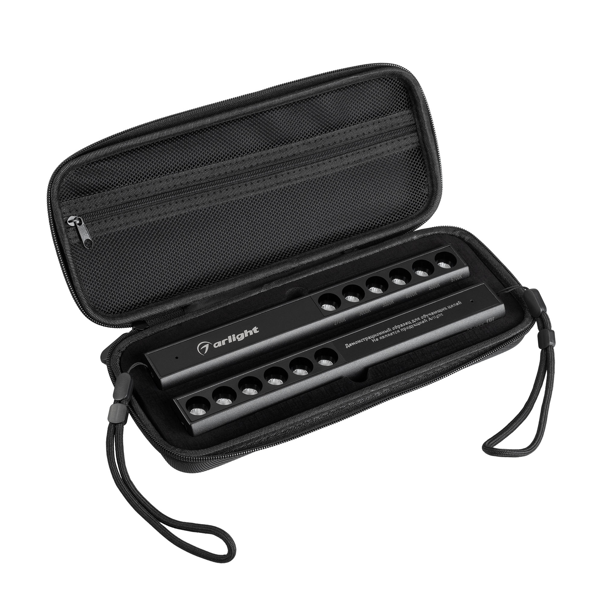 Демо-кейс для демонстрации переносных светильников мощностью 3Вт со встроенным аккумулятором, с регулировкой яркости и 6 оттенками цвета свечения (теплый 2700K, теплый 3000K, теплый 3500K, дневной 4000K, дневной 5000K, белый 5700K). У светильников разный индекс цветопередачи - CRI70 и CRI90. Габариты кейса 280x110x50мм. Размер светильников: длина 228 мм, ширина 31 мм, высота 26 мм. В комплект входят сумка-кофр, 2 светильника, разъем для зарядки USB Type-C, кабель 1 м - 2 шт. Зарядное устройство в комплект не входит.