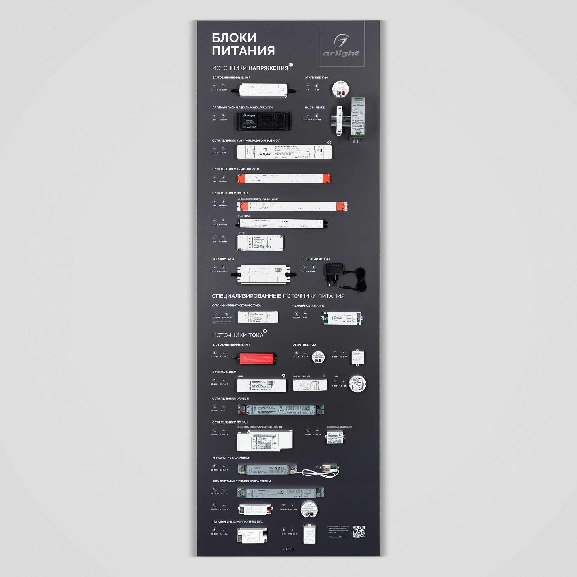 На стенде представлен широкий ассортимент блоков питания Arlight для различных источников освещения: светодиодные ленты, светильники, мощные светодиоды и т. п. Показаны варианты встройки блоков питания в ниши и в профиль. Реализован механизм плавного включения светодиодной ленты.