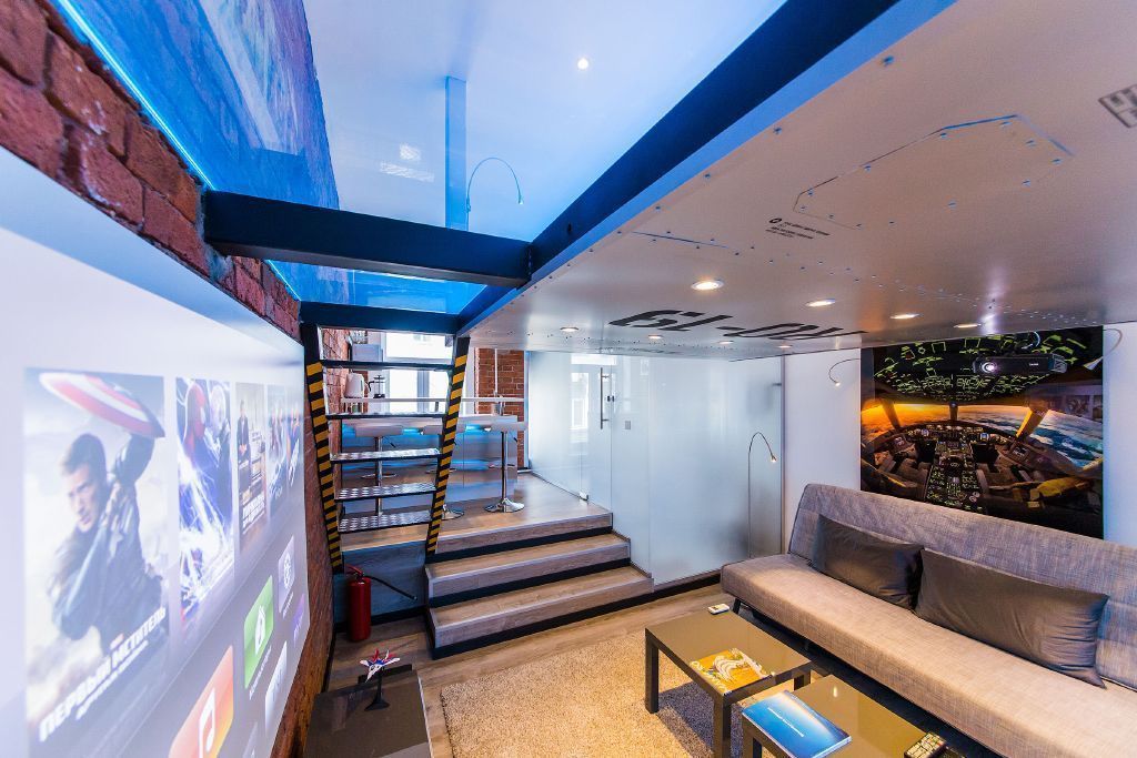 Светодиодная подсветка и светодиодное освещение в квартире-студии дополняет интерьер, выполненный в авиа-тематике.