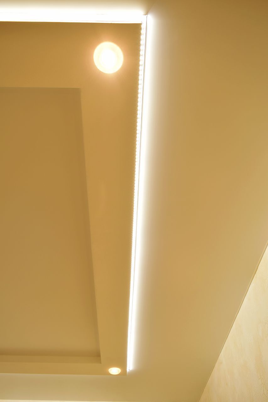 Дополнительное светодиодное освещение в многоуровневом потолке из гипсокартона. Зонирование помещения вертикальными линиями света.
